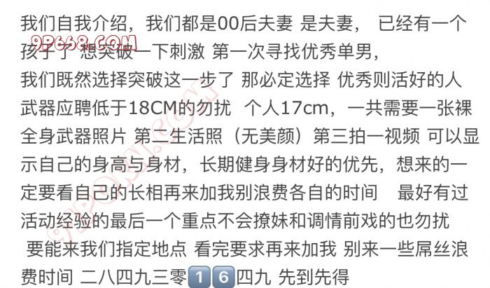 仔细阅读以下内容,优秀单男来联系 老婆说了 无美颜生活照第一眼阳光暖男的优先,达到要求可联系 我不缺钱 别试图用钱来打破这扇门 老婆是被服务型,希望你能在30分钟以上