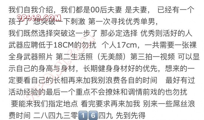 仔细阅读以下内容,优秀单男来联系 老婆说 第一眼看起来阳光暖暖的男生加分,年龄不低于24不高于28,达到要求可联系 我不缺钱 别试图用钱来打破这扇门 老婆是被服务型,一定要会舔会撩的,希望你能在30分钟以上 .