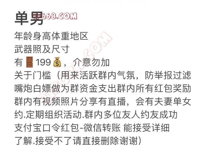 关于门槛:过滤嘴炮白嫖屌丝,作为群资金活跃气氛,群内视频照片分享直播,夫妻单女线下邀约,群内多位成员约友成功